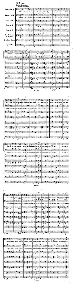 Das erste Orchester besteht aus 2 Trompeten in C, 2 Trompeten in D, 2 Hörnern in G, 2 Hörnern in C, 3 Posaunen (ATB) und 1 Ophikleide. Das kleine zweite Orchester setzt sich aus 2 Trompeten in C, 2 Hörnern in D und 3 Posaunen (ATB) zusammen.