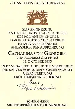 1984 wurde in der Tradition des Laienspiels Catharina von Georgien von Andreas Gryphius aufgeführt (Deutsche Erstaufführung am 15. September 1984, weitere Aufführungen am 16. September 1984, 22. September 1984, 23. September 1984), szenisch deutlich bearbeitet von Hermann Wedekind und gespielt von der Balver Höhlenspielgemeinschaft, einem zum überwiegenden Teil aus Laiendarstellern bestehenden Ensemble unter Mitwirkung von persönlichen Freunden Hermann Wedekinds, Chören und Orchestern aus dem heimischen Raum und dem Jugend Blasorchester Stockach, damals noch Jugendtrachtenorchester Stockach. 1800 Zuschauer verfolgten die Aufführungen.