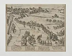 Aufgrund der durch Konfessionalisierung steigenden Gefahr politischer Unruhen in der Region, die im 17. Jahrhundert beim Jülich-Klevischen Erbfolgestreit erstmals kulminierte, wurden die Befestigungsanlagen stetig verbessert.[6] Nachdem Herzog Wolfgang Wilhelm von Pfalz-Neuburg durch den Vertrag von Xanten im November 1614 mit dem Herzogtum Berg auch Düsseldorf zugesprochen bekommen hatte, forcierte er den weiteren Ausbau der Festung. Hierzu berief er Antonio Serro nach Düsseldorf. Auch Adolph vom Kamp nahm er als Baumeister in seine Dienste. Während des Dreißigjährigen Krieges und des Niederländischen Freiheitskriegs blieb das Herzogtum Jülich-Berg neutral. Dennoch kam dessen Hauptstadt 1630 unter schweren Beschuss, da in Düsseldorf spanische Soldaten einquartiert waren. Herzog Wolfgang Wilhelm gelang es, weiterhin die Neutralität zu bewahren, indem er den Abzug der Spanier und die Schleifung anderer Festungen im Herzogtum zusagte. Düsseldorf behielt seine Festungsanlagen und baute diese weiter aus. Im Schwedenkrieg forderte die kaiserliche Seite Wolfgang Wilhelm 1634 auf, seine Neutralität aufzugeben. Im Gegenzug sollte Düsseldorf von den Spaniern Mittel erhalten, seine Festung weiter zu verstärken. Das betraf besonders den Bau eines linksrheinischen Forts. Einen Rückschlag erfuhr der Ausbau noch im selben Jahr, als ein Blitz den Pulverturm zerstörte. Bei der Explosion wurden neben zahlreichen Häusern auch die Kirche St. Lambertus und das Düsseldorfer Schloss in Mitleidenschaft gezogen.[7] Da die umgebenden Orte und Ackerflächen am Niederrhein und im Bergischen Land weitgehend von durchziehenden Truppen und marodierenden Banden verheert worden waren, suchten immer mehr Flüchtlinge Schutz in der Festung Düsseldorf. Durch den plötzlichen Bevölkerungszuwachs durch die Flüchtlinge und durch einquartierte Garnisonen kam es zu Versorgungsengpässen für die Menschen innerhalb der Mauern, zumal durch die zerstörte landwirtschaftliche Infrastruktur kaum noch Lebensmittel in die Stadt gelangten. Mehrfach brachen Seuchen aus. Der Graben der um 1641 fertiggestellten Zitadelle in der Südstadt wurde benässt. Zudem erhielt sie zwei Bastionen zur Neustadt hin: die Bastionen Diemantstein am Spee’schen Graben sowie St. Thomas, in die das Haus des Gouverneurs integriert wurde. Auch der Rheinhafen (heute Schulstraße) bekam mit der Spee’schen Bastion ein modernes Festungswerk. In diesem Rahmen erfolgte auch der Ausbau der Bastionen Elisabeth Augusta und Fridericus sowie der Flinger und der Berger Bastion. Zwischen die Bastionen wurden in das Grabenwerk Ravelins gebaut und zusätzliche Gräben angelegt. Am Rheinufer und vor den Bastionen entstanden vorgelagerte Lünette. Als Landesbaumeister dieser Phase der Festungsgeschichte ist insbesondere Johann Lollio nachgewiesen.