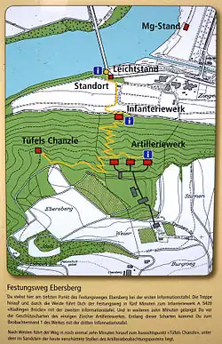 Auf dem Ebersberg gab es bereits in prähistorischer Zeit eine Wehranlage. Das Artilleriewerk Ebersberg wurde in den Jahren 1938 bis 1940 in Handarbeit in die Sandsteinschicht des Ebersbergs gebaut. 1978 wurden die veralteten Kanonen ausgebaut. Das Werk wurde bis zur Entklassifizierung im April 2003 noch für andere militärische Zwecke genutzt. Im Mai 2003 hatte die Öffentlichkeit erstmals Gelegenheit, einen Blick ins Innere der bis dahin geheimen Anlage zu werfen. Die Festung ist bis heute (2018) in ihrem guten Originalzustand erhalten: Die Lüftung ist betriebsfähig und die beiden Dieselmotoren erzeugen auf Knopfdruck Strom.