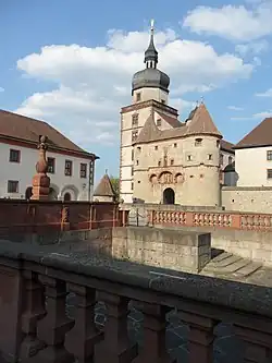 Die den Burghof umschließende Burg wird an drei Seiten von Türmen begrenzt, dem Randersackerer Turm (Sonnenturm) im Südosten, den Marienturm im Nordosten und den Kiliansturm im Nordwesten. Auf dem Marienturm befindet sich das gleiche Bild der Maria im Strahlenkranz wie auf dem Turm der Marienkapelle am Markt (in Sichtverbindung). Durch das Scherenbergtor erfolgt der Zugang zum inneren Burghof. Um 1500 wurde die von Fürstbischof Lorenz von Bibra in Auftrag gegebene „Bibratreppe“ als Zugang zur Bischofswohnung im Fürstenbau errichtet und 1511 der neue Treppenturm[52] fertiggestellt. Ab 1572 veranlasste Fürstbischof Julius Echter von Mespelbrunn große Neu- und Umbauten im Renaissancestil. Zwischen Scherenbergtor und dem Museum für Franken befindet sich das Außenportal der Echter-Bastei mit dem 1606 fertiggestellten Echtertor, über dem eine Statue des Erzengels Michael, dem „Reichspatron und Schutzengel der Gegenreformation“, angebracht ist.[53]