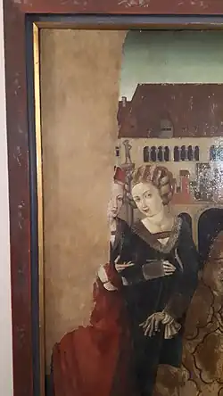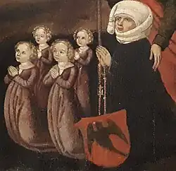 In der rechten Ecke des Gemäldes befinden sich weibliche Stifterfiguren. Hinter der ältesten Frau steht ein Heiliger, der in seiner rechten Hand eine Hellebarde hält. Er trägt ein dunkles Gewand unter einem roten Mantel und hat einen Bart und braune Haare. Seinen Kopf umgibt ein goldener Nimbus. Die linke Hand des Heiligen ruht auf der Schulter der ältesten Frau. Sie trägt ein dunkles Gewand und um hat Kopf und Hals ein weißes Kopftuch gewickelt. In den Händen hält sie einen Rosenkranz. Neben ihr knien vier Mädchen. Alle tragen helle Gewänder und haben hochgesteckte, blonde Haare. Vor den Figuren befindet sich ein weiteres Wappen.