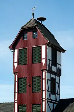 Das ursprüngliche Gebäude ist eingeschossig, hat ein Krüppelwalmdach und ist mit Klinkern verblendet. Auf dem verbretterten und mit Fachwerk verkleideten Steigerturm befindet sich eine Wetterfahne mit der Jahreszahl 1906 als Gründungsjahr der Feuerwehr. Über dem Portal ist die Inschrift „Bereit zu sein auf jeden Hilferuf. Ob Freund ob Feind in Not beschützen. Das ist des Wehrmanns eh-render Beruf. Freiwillig seinem Nächsten nutzen.“ angebracht. Der Anbau ist ein massiver Bau aus Ziegelmauerwerk mit Walmdach.[5]