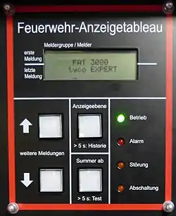 In Deutschland fordert die DIN 14675 ein FAT bei BMA mit Alarmweiterleitung an die Feuerwehr.[1] Nach DIN 14675 hat sich das Feuerwehr-Anzeigetableau an der Erstinformationsstelle für die Feuerwehr zu befinden, in räumlicher Nähe mit dem Feuerwehr-Bedienfeld und den Feuerwehr-Laufkarten. Das FAT hat gut sichtbar, bedienbar und frei zugänglich zu sein. Gegebenenfalls ist es zu kennzeichnen. Die Planung und Montage hat in Absprache mit der zuständigen Feuerwehr entsprechend deren Anschlussbedingungen zu erfolgen.
