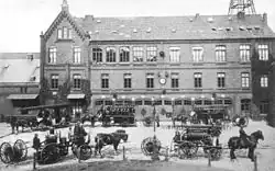 Am 11. Mai 1870 wurde die Berufsfeuerwehr gegründet, die 85 Mann mit drei großen Handspritzen, fünf Wasserwagen und einem Mannschaftswagen umfasste.[5] Die Hauptwache wurde zunächst in der Königstraße (heute Dechanatstraße) eingerichtet, aber noch im selben Jahr in die Straße Am Wandrahm verlegt, wo sie sich auch heute noch befindet. Die alte Brand-Löschanstalt wurde aufgelöst und ein Branddirektor als Leiter der Feuerwehr eingesetzt. In der Folge entstanden mehrere Feuerwachen, über die Stadt verteilt. Im Jahr 1890 wurde die Ausrüstung der Feuerwehr verbessert und ein System aus Hydranten und Feuermeldern eingerichtet. Im selben Jahr übernahm die Feuerwehr auch die Krankentransporte.