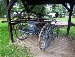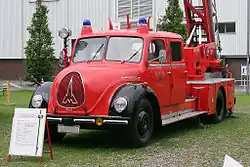 Die ersten Feuerwehrfahrzeuge wurden handwerklich gefertigt und basierten auf dem Bau von Kutschen und Wagen. Bis zum Ende des 19. Jahrhunderts existierten im Wesentlichen nur zwei Typen von Feuerwehrfahrzeugen: Der Spritzenwagen und die Schiebleiter, welche entweder von Pferden oder von der Mannschaft selbst zur Einsatzstelle gezogen wurden.[8] Sie waren aus Holz gebaut und wurden durch Muskelkraft betrieben, weshalb man sich im Einsatz nicht immer auf sie verlassen konnte. Infolge der Industrialisierung kam es zur Technisierung und damit zur Motorisierung der Feuerwehren, allerdings nur sehr zögerlich, da man seitens der Feuerwehrleute Bedenken hatte, mit benzingetriebenen Fahrzeugen nahe an Brände heranzufahren. Die Geschichte moderner Feuerwehrfahrzeuge beginnt im Jahre 1902, als das Freiburger Unternehmen Grether & Cie. das erste Feuerwehr-Kraftfahrzeug der Welt mit einem Verbrennungsmotor fertigte.[9] Der nächste Meilenstein folgt 1904, als Magirus (später Magirus-Deutz und heute Iveco Magirus) die erste motorgetriebene Drehleiter baute, welche jedoch weiterhin von Hand ausgefahren werden musste. Kurz darauf folgten Motorpumpen, was der Firma Magirus zum wirtschaftlichen Aufstieg verhalf. Auch andere Hersteller von Feuerwehrtechnik begannen damals, Feuerwehraufbauten auf Lastkraftwagen-Fahrgestellen zu installieren.