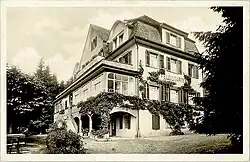 Es handelt sich um einen dreigeschossigen Bau mit Heimatstilformen. Das Erdgeschoss ist gemauert, die Obergeschosse sind verschindelt. Der Hauptfassade ist ein zweigeschossiger Anbau mit Flachdach vorgelagert, der heute vermauert und mit modernen Fenstern versehen ist. Das schlicht gestaltete Haus deckt ein mächtiges Mansardwalmdach, das an der Hauptfassade ein dreiachsiges geschweiftes Zwergdach und zwei seitliche Dachgauben mit rundbogigem Abschluss besitzt.[3]