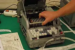 Demgegenüber existiert bei der M‑125‑3MN dieser Hebel nicht mehr. Diese Maschine ist eine Zwei-Register-Maschine. Mit dem entsprechenden Tastendruck (A…, 1…) kann man auf die unterschiedlichen Register umschalten. Die M‑125‑3MN verfügt über zwei austauschbare Typenräder (lateinisch ↔ kyrillisch).