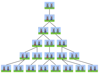 - ↑ Dazu muss festgestellt werden, dass dies ein theoretisches Gedankenmodell ist, das sich in der Praxis nicht so abbildet. Der Grund liegt in den individuellen Genen der Kaninchenmütter und der sich verändernden Geburtenrate. Es gibt Mütter, die über die Zeit zunehmend mehr Nachkommen haben, wenn sie mehr gebären konnten, während andere weniger Nachkommen haben, nachdem sie einen großen Wurf hatten. Zudem passen Kaninchen so wie auch Mäuse ihre Wurfgröße genetisch festgelegt an das Nahrungsangebot an, indem sie Gene an- und abschalten, welche die Fertilität steuern und Keimverzögerung sowie Befruchtungswillen beeinflussen.