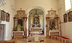 Das Kircheninnere zeigt sich als flach gedecktes vierjochigen Langhauses mit flachen Doppelpilastern. Der Triumphbogen ist rundbogig und hat eine Putzfeldgliederung. Die Orgelempore ist flach unterwölbt. Der schmale leicht erhöhte Chor ist zugleich das Erdgeschoß des Turms und hat ein barockes Kreuzgewölbe auf flachen Pilastern.