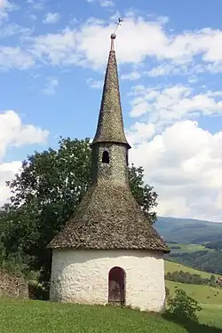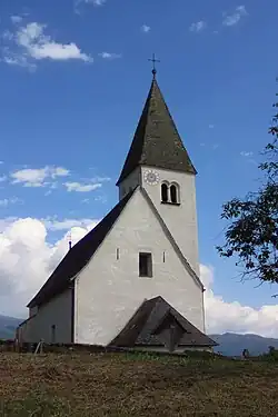 Die ursprünglich romanische Kirche besteht aus einem Langhaus wohl aus dem 13. Jahrhundert und einem von dreistufigen Strebepfeilern gestützten Chor aus dem 14. Jahrhundert. Die Maßwerkfenster wurden teilweise vermauert. Bei der Restaurierung der Kirche 1993 wurde ein spätgotisches Fries freigelegt. Der Turm an der Langhaussüdseite besitzt gekuppelte, gotische Schallfenster, die zum Teil mit Maßwerk versehen sind. Er wird von einem Pyramidenhelm bekrönt. Die älteste Glocke stammt aus dem 13. Jahrhundert, weitere Glocken wurden um 1350 bzw. um 1450 gegossen. In der gemauerten Vorhalle finden sich vier römerzeitliche, teilweise fragmentarische Grabinschriften, die sowohl durch ihre Schriftform wie auch durch sprachliche Ungenauigkeiten auf die sehr oberflächliche Romanisierung der Bevölkerung entlegener Landstriche hinweisen. In einer Grabinschrift scheint der Name der keltischen Pferdegöttin Epona auf. Das spitzbogige Westportal besitzt eine Tür mit gotischen Beschlägen.