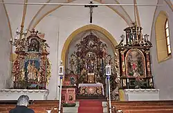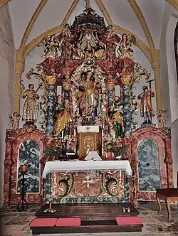 Auf dem barocken Hochaltar mit Opfergangsportalen stehen die Figuren der Heiligen Michael, Barbara, Matthäus, Notburga und Isidor. Die Figurengruppe im Aufsatz zeigt die Krönung Mariens. Der Altar wurde 1755 erbaut und 1972 restauriert.