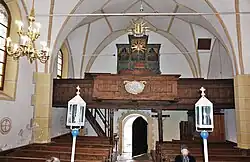 Im Langhaus ruht ein Netzgratgewölbe mit stuckierten Graten und Tartschen auf polygonalen Wandpfeilern. Der spitzbogige, abgefaste Triumphbogen verbindet das Langhaus mit dem um fünf Stufen erhöhten Chor, der nach Süden aus der Achse verschoben ist. In dem einjochigen Chor mit Fünfachtelschluss erhebt sich ein Netzrippengewölbe auf Runddiensten. Ein spätgotisches Spitzbogenportal mit einer Eisenplattentür führt in die Sakristei.