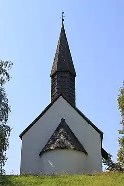 Das Gotteshaus ist ein im Kern romanischer Bau mit Vorlaube, eingezogener Rundapsis und einem spitzen Dachreiter im Osten. Man betritt die Kirche durch das rundbogige, gotische Südportal. Das Langhaus aus dem späten 17. Jahrhundert hat eine flache, zum Teil mit Schablonenmalerei bemalte Holzdecke. Die Apsis wurde 1670 bühnenartig ausgestaltet. Sie ist mit einer frühbarocken, von den Erzengeln Michael und Gabriel flankierten Säulen- und Nischenarchitektur bemalt. In der Apsiswölbung ist die heilige Dreifaltigkeit dargestellt. Auf dem Hochaltar sind eine Schnitzgruppe des Pfingstwunders, ein Kruzifix, eine Nachbildung des Heiligen Grabes, eine Schmerzhafte Muttergottes und ein Tabernakel von 1857.