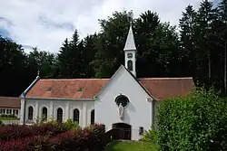 1954 wurde beim Zusammenbau die ehemalige gedrungene Kapelle als Zentralbau mit querschiffartigen Giebeln und neoromantischen Rundbogenfriesen mit einem zentralen Firstturm stark verändert. Der Glockenturm wurde dabei verlegt und über dem neuen leicht höheren Zwischenbau aufgebaut. Bemerkenswert ist die Architektur von ehemaliger Bethalle und nunmehrigem Langhaus. Über einer Sockelzone aus Quadermauerwerk zeigt die Fassade eine Quaderrustika in Rauputz mit Pilastern und Rundbogenfenstern. Die Giebelfassade mit kräftigen Eckpfeilern hat ein Ädikulaportal mit Stützen und Kapitellen mit Scheibenwürfel mit Engelsköpfen und vegetabilen Kämpferfriesen.