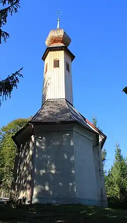 Die Kirche wurde 1710–1712 errichtet und 1843 vergrößert. Sie besteht aus einem vierachsigen Langhaus, einem eingezogenen Chor mit Fünfachtelschluss und einem hohen, hölzernen Dachreiter mit Zwiebelhelm. Christoph Brandstätter der Jüngere malte 1844 Szenen aus dem Marienleben an die Flachdecke des Langhauses.