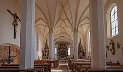 Das westliche Joch der Kirche ist kleiner als die drei folgenden. Die Seitenschiffe haben Kreuzrippengewölbe, das Mittelschiff ein Netzrippengewölbe.