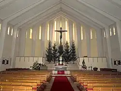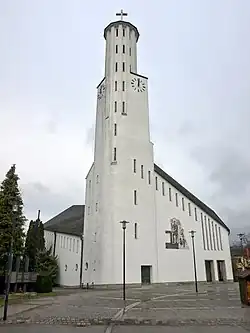 Die Kirche in Skelettbauweise zeigt sich als Schiff Petri und als expressionistischer Bau mit einem beherrschenden Fassadenturm und Bewegung suggerierenden an- und absteigend konstruierten Dächern. Die Ostfassade zeigt ein monumentales Mosaik Heilige Familie vom Maler Hermann Bauch (1968).