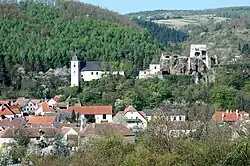Das Kirchenäußere zeigt ein Langhaus mit einem in die Ringmauer der ehemaligen Vorburg einbezogenen rund geschlossenen Chor. Es gibt kleine Rundbogenfenster und Rechteckschlitze, der Turm zeigt ostseitig eine monumentale Wandmalerei des hl. Christophorus aus dem Anfang des 16. Jahrhunderts. Der zweigeschoßige Turm hat Spitzbogen- und Dreipassschlitze und rundbogige Schallfenster. Nordöstlich am Langhaus befindet sich ein teils freigelegtes romanisches Portal aus Hausteinquadern.