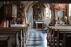 Der mit Fruchtgehänge dekorierte Hochaltar von 1688 birgt in der Mittelnische eine Statue des Apostels Andreas, flankiert von den Figuren der Heiligen Nikolaus und Ulrich aus der Mitte des 15. Jahrhunderts. Die beiden Seitenaltäre entstanden am Ende des 17. Jahrhunderts. Das Altarblatt des linken Seitenaltars zeigt den Unterricht Mariens. Seitlich stehen die Statuetten der Heiligen Andreas und Antonius von Padua aus dem 17. Jahrhundert. Der rechte Seitenaltar stellt im Mittelbild den heiligen Antonius von Padua dar und trägt die Skulpturen der Heiligen Oswald und Johannes Nepomuk sowie eine kleine Kreuzigungsgruppe.