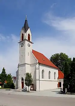 Der neogotische Saalbau mit einem Westturm wurde 1868/1870 nach den Plänen von Friedrich von Schmidt und seinen Schülern Wilhelm Rollig und Ludwig Wächtler erbaut. Nach Zerstörungen durch Fliegerbomben 1944 wurde die Kirche 1950/1953 durch den Architekten Johann Zahlbruckner in vereinfachter Form wieder aufgebaut. 1983 und 1997/1998 wurde sie restauriert.