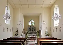 Das Kircheninnere zeigt einen Saalraum unter einer Flachdecke mit einem eingezogenen Rechteckchor und eine eingezogene Westempore.