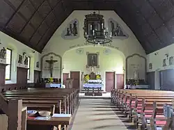 Das Innere ist großteils aus Holz ausgestaltet. Die Wandmalereien stammen von Josef Fischer.[1]