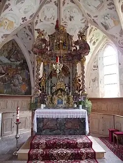 Der Hochaltar stammt aus der Barockzeit, die gotische Pietà in der Mittelnische entstand um 1430. Die Statuen der hll. Florian, Sebastian und Adolar wurden um 1770 geschnitzt. An der Brüstung der hölzernen Westempore befinden sich Brustbilder von heiligen Klerikern, die um 1688 geschaffen wurden.