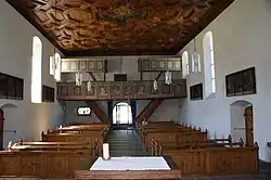 Das Langhaus unter einem Satteldach zeigt keine plastische Gliederung. Der Chor ist stark eingezogen, der Nordturm steht im Chorwinkel, die Sakristei im südlichen Chorwinkel, südlich am Langhaus und der Sakristei befindet sich ein kleiner Kapellenanbau. Der Turm hat ein verjüngtes Obergeschoß und abgefaste spitzbogige Schallöffnungen, er trägt einen Spitzgiebelhelm. In der Langhaussüdwand befindet sich ein Rundbogenportal unter einem Vordach, in der Langhausnordwand ein Flachbogenportal mit einer Holztür aus 1710. Die Westfront hat ein niedriges Vorzeichen unter einem Krüppelwalmdach aus sechs Holzstützen und einer flachen Holzfelderdecke mit Rankenmalerei, das weite Hauptportal ist rundbogig.