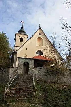 Die von einer Friedhofsmauer umgebene spätgotische Kirche wurde im Barock erweitert. Der Kirchturm mit barocken Schallfenstern und Helm steht an der Nordseite des Langhauses. Die Westfassade mit Portalvordach besitzt im Giebelfeld eine große Figurennische. Im 17. Jahrhundert wurde die Kirche um ein Joch nach Westen verlängert und um die Seitenschiffe verbreitert. Aus der Barockzeit stammen der Kapellenanbau an der nördlichen Schrägwand und der Anbau an der Südseite, der als Sakristei dient. Das Langhaus ist mit Ausnahme des kreuzgratgewölbten westlichen Joch mit einer Tonne gewölbt, die zum Teil Stichkappen aufweist. Ein hoher spitzbogiger Triumphbogen verbindet das Langhaus mit dem einjochigen Chor mit Fünfachtelschluss und einfachen Maßwerksfenstern aus dem 15. Jahrhundert. Hier erhebt sich ein Netzrippengewölbe über zarten polygonalen Wanddiensten.