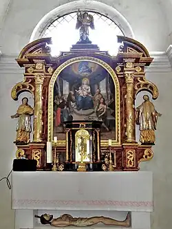 Der um 1680 gebaute, linke Wandaltar besteht aus einer Ädikula auf einem Sockel mit seitlichen Konsolfiguren unter Baldachinbögen und einem gesprengten Segmentgiebel mit einer Monstranz als Aufsatz. Das Altarblatt zeigt Christus am Ölberg, das Aufsatzbild den Erzengel Michael. Eine Figur im Hauptgeschoß stellt den heiligen Johannes Nepomuk, eine im Aufsatz den heiligen Rochus dar. Die beiden anderen Heiligenstatuen sind ohne Arttibute.