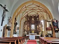 Im dreijochigen Langhaus befand sich wohl ursprünglich ein Kreuzrippengewölbe. Jetzt ruht ein Tonnengewölbe mit Stichkappen auf gotisch profilierten Wandvorlagen. Die dreiachsige, spätgotische Westempore ist kreuzrippenunterwölbt und an den Schlusssteinen mit Wappenschildern versehen. Die Emporenbrüstung ist durch vorgeblendete Stäbe in 13 Felder unterteilt. Ein profilierter Triumphbogen verbindet das Langhaus und den Chor mit Fünfachtelschluss und einem Netzrippengewölbe. Chor und Langhaus haben zweibahnige Maßwerkfenster. In der barocken, kreuzgewölbten Kapelle nördlich des Chores ist die Gruft des Michael von Pughelsheim († 1688) untergebracht. Ein spätgotisches Kielbogenportal führt vor dem Triumphbogen an der Nordseite des Langhauses in die Sakristei.