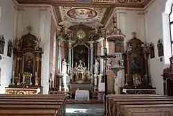 Das Kircheninnere zeigt ein Langhaus unter einer flachen Decke mit flachen Stuckpilastern, die Empore mit einer geschwungenen Brüstung steht auf hölzernen Säulen und hat eine Wendeltreppe. Der eingezogene gotische Chor hat einen Fünfachtelschluss und eine Flachdecke, das gotische Portal zum Turm ist spitzbogig. Die Fenster haben Konvexbögen als Abschluss.
