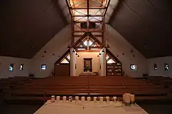 Die Kirche besitzt unter dem Dach die erwähnten Glasfenster, während sich im unteren Teil des Gebäudes fast keine Fenster finden. Der auffällige Holzturm, der sich im vorderen Teil der Filialkirche befindet, ist in das Dach integriert.