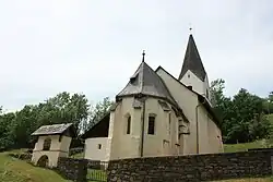 Vom romanischen Kirchenbau haben sich die Mauern des Langhauses erhalten. Über dem jetzigen Gewölbe sind die Ansätze der ursprünglichen flachen Balkendecke sichtbar. Ein weiteres Relikt der Romanik sind die Reste eines Christophorusfreskos aus dem 13. Jahrhundert. Der eingezogene Chor mit Fünfachtelschluss und Steinplattldeckung stammt aus der Gotik. Unter dem Chor befindet sich eine gotische Beinkammer. Der gotische Turm stürzte 1987 ein und wurde 1989 wiedererrichtet. Betreten wird die Kirche durch ein einfach gekehltes gotisches Portal mit schmiedeeisernem Schlüsselfang.