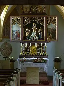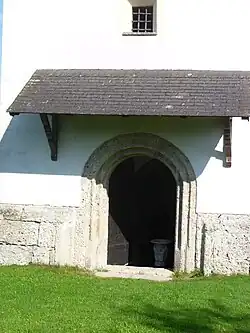 Das Langhaus der Kirche besteht aus romanischen Mauern. Die Wände waren damals bis zur abschließenden Flachdecke verputzt. In spätgotischer Zeit wurde ein Chor eingefügt und das Langhaus mit Gewölben versehen. Ein 1465 gewährter Ablass könnte mit diesen Bauarbeiten in Verbindung stehen. Der Westturm mit Dreiecksgiebeln und Spitzhelm stammt aus der Zeit um 1500. Ursprünglich stand der Turm frei, vermutlich weil das Langhaus vergrößert werden sollte; im 16. Jahrhundert wurde der Turm mittels eines Zwischenjoches an das bestehende Langhaus angebunden.