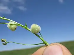 Die Blütezeit reicht von März bis April. Die Blüten sind über achselständigen, kurzen Blütenstandsschäften, in bei einer Größe von 6 bis 9 Millimetern kugeligen und köpfchenförmigen Blütenständen angeordnet, zur Fruchtzeit sind die Fruchtstände blasig auf 8 bis 15 Millimeter vergrößert. Die, kleinen Blüten sind mehr oder weniger sitzend und so gedreht, dass die Fahne nach unten und das Schiffchen nach oben zeigt.