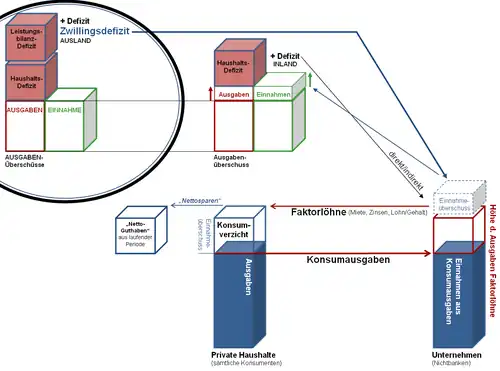 Verringert ein Staat also sein Defizit (Ausgabenüberschuss), muss bei ausgeglichener Leistungsbilanz entweder der Unternehmenssektor seinen Ausgabenüberschuss (Verschuldung) erhöhen oder der Sektor der privaten Haushalte sein Geldsparbemühungen verringern.[12] Erhöhen die Unternehmen ihre Investitionen nicht um die Höhe der (gewohnten)[13] gesunkenen Staatsausgaben, sondern reduzieren diese ihre Investitionen sogar, sinken die Einnahmen in der Ökonomie nicht nur um die Höhe der reduzierten Ausgaben der Staatsausgaben und Unternehmensinvestitionen, da das gesamtwirtschaftliche Einkommen zu sinken beginnt und tendenziell Kaufzurückhaltung und die Bildung monetärer Reserven initiiert wird.[14]