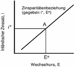 Dabei wird die Zeitkomponente t vernachlässigt und der Wechselkurs E als konstant gesehen. Somit gibt diese Gleichung den aktuellen Wechselkurs in Abhängigkeit vom zu erwarteten Zinssatz an. Somit kann man sagen, dass die inländische Währung unmittelbar aufgewertet wird, wenn der inländische Zinssatz i steigt und umgekehrt sinkt der Wert für die inländische Währung, wenn der ausländische Zinssatz ansteigt. Steigt der erwartete zukünftige Wechselkurs bei gegebenem Zinssatz an, so schlägt sich das bereits im In- und Ausland in einer Aufwertung nieder.[3] In der realen Welt spielt dieser Zusammenhang zwischen inländischem Zinssatz und Wechselkurs eine entscheidende Rolle.