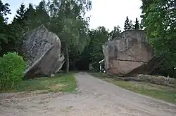 - Die Markgrafensteine in den Rauenschen Bergen bei Bad Saarow, Brandenburg. Der Große Markgrafenstein war ursprünglich der mit geschätzten 700 bis 750 Tonnen größte landliegende Findling in Norddeutschland (heute zerteilt, unter anderem für die größte Granitschale der Welt im Lustgarten in Berlin). Er war 7,8 m lang, 7,5 m breit, 7,5 m hoch bei einem Volumen von rund 250 m³. Der Kleine Markgrafenstein ist jetzt der größte Findling Brandenburgs. Beide Steine bestehen aus Karlshamn-Granit, der aus Südschweden stammt.