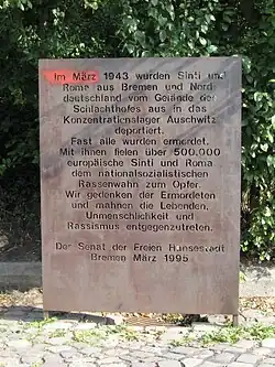- Gedenktafel von 1995 zur Erinnerung an den Völkermord an Sinti und Roma