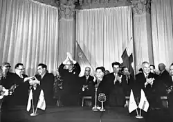Ein endgültiger Frieden zwischen Finnland und der Sowjetunion wurde 1947 im Frieden von Paris geschlossen. Dabei musste Finnland noch zusätzlich den Hafen von Petsamo an die Sowjetunion abtreten. Es konnte aber als einziger Nachbar der Sowjetunion seine Unabhängigkeit und Demokratie nach dem Zweiten Weltkrieg erhalten. Im Gegenzug erklärte Finnland seine außenpolitische Neutralität und konnte deshalb auch nicht der NATO beitreten, um auf die Sicherheitsinteressen der Sowjets Rücksicht zu nehmen (Finnlandisierung). Der Status als neutrales Land gab der Sowjetunion erheblichen Einfluss auf die Außenpolitik und Innenpolitik Finnlands. So intervenierten die Sowjets diplomatisch, als die finnische Regierung von 1958 unter Karl-August Fagerholm nicht ihren Wünschen entsprach. Zu einer weiteren politischen Krise kam es 1961 mit der Notenkrise, die durch die guten Kontakte zwischen dem finnischen Präsident Urho Kekkonen und dem sowjetischen Parteichef Nikita Chruschtschow beigelegt werden konnte. Während des gesamten Kalten Krieges blieb die finnische Außenpolitik ein Balanceakt zwischen Ost und West.[5] Als neutraler Standort war Helsinki 1973 Standort der ersten Konferenz über Sicherheit und Zusammenarbeit in Europa. Auch wirtschaftlich hatte die Neutralität Vorteile für das Land, da es zu den wenigen westlichen Ländern mit engen Handelsbeziehungen zum Ostblock gehörte und Holz, Papier, Maschinen und Fahrzeuge in die Sowjetunion exportierte und im Gegenzug Rohöl erhielt.[6]