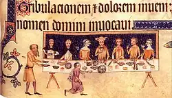 Das individuelle Geschirr und Besteck des Spätmittelalters gilt durch verfügbare ikonografische Quellen und archäologisches Fundgut als insofern hinreichend erschlossen, dass eine generelle Darstellung der spätmittelalterlichen Tafel relativ klar umrissen werden kann.[37] Als zentrale persönliche Essunterlage wurden laut zahlreichen Abbildungen des Spätmittelalters[38][39][40][41] Stücke geschnittenen Brotes für feste, und Essschalen bzw. -teller[42] für weiche bzw. flüssige Speisen verwendet. Das Schneiden von Brot und das Holen der bereits mundgerecht geschnittenen bzw. tranchierten Speise vom Servierteller wurden mit dem Essmesser oder direkt mit der Hand getätigt, wobei das Brotstück simultan als Essunterlage und als Universalbeilage diente. Daneben gehörten je nach Speise Servier-Schalen,[43] Trinkbecher bzw. Trinkglas[44] sowie Teller[45][46] und Löffel[47] aus Holz, Keramik und Metall dazu.[48] Die Gabel als persönliches Essbesteck war nicht üblich, stattdessen betrachtete man das Essmesser,[49] ähnlich den Essstäbchen der Fernen Ostens, als eine Art Universalwerkzeug zur Nahrungsaufnahme.