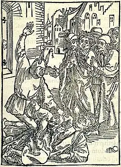 Es gibt ein mittelalterliches Bild einer einen Nachttopf auf die Straße kippenden Frau, welches oft als vermeintlicher Beweis angeführt wird, die Menschen im Mittelalter hätten ihren Abfall und Exkremente auf die Straße entsorgt.[24] Es handelt sich bei dieser Quelle dabei aber um einen Ausschnitt aus „Das Narrenschiff“, einem satirischen Stück grobianischer Dichtung, in welchem lärmende Narren absichtlich mit dem Inhalt des Topfes übergossen werden um diese loszuwerden. Diese Handlung wurde und wird falsch interpretiert, indem nur das aus dem Kontext gerissene Bild der Frau im Fenster gezeigt und als „Beleg“ für Müllentsorgung durchs Fenster auf die Straße dargestellt wird.[25]