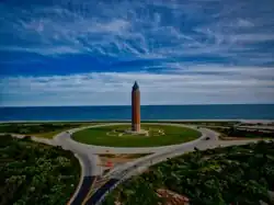 Wasserturm und Kreisverkehr des Robert Moses Causeway. Im Hintergrund der Atlantik.