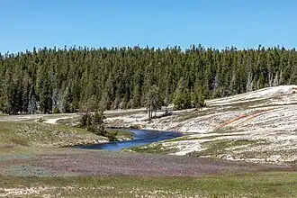 Das Mittlere Geysir-Becken entwässert vollständig in den östlich verlaufenden Firehole River (rechts) -