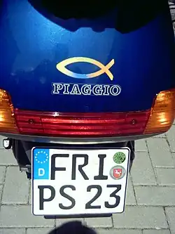 Ichthys-Symbol auf einem Motorroller mit zusätzlichem Hinweis auf Psalm 23 im Kennzeichen