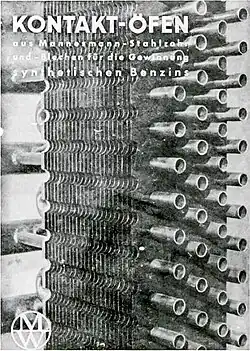 Die Ruhrchemie erwarb die Rechte an dem Verfahren. Sie errichtete die erste industrielle Fischer-Tropsch-Anlage 1934 am Standort Holten.[6] Während des Zweiten Weltkriegs erlangte die Fischer-Tropsch-Synthese kriegswirtschaftliche Bedeutung in Deutschland. Mit ihr konnte unter anderem ein Teil des Bedarfs an flüssigen Kraftstoffen und Kogasin gedeckt werden.[7] Insgesamt errichtete die Industrie bis zum Ende des Zweiten Weltkrieges neun Anlagen nach dem Fischer-Tropsch-Verfahren mit einer Kapazität von rund 600.000 Jahrestonnen. Im Jahr 1942 betrug die Produktionsmenge in Deutschland für das Niederdruckverfahren 427.400 Tonnen und für das Mitteldruckverfahren 128.800 Tonnen.[8] Im Gegensatz zu den Produkten des Bergius-Pier-Verfahrens, die vor allem für Motor- und Flugtreibstoffe verwendet wurden, dienten die Fischer-Tropsch-Produkte weitgehend als Dieselkraftstoff und als paraffinischer Rohstoff für die chemische Industrie.[9]