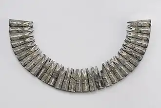 Fischkopfförmige Anhänger sind häufig als Halsschmuck gefunden worden. Die meisten sind in so guten Zustand, dass die vorhandene Ornamentik aus fünf, sieben oder neun Kreisaugen erkennbar ist. Das meist an der Mündung platzierte Muster variiert sogar unter den Anhängern der gleichen Halskette. Gegossene Exemplare sind lediglich in Horten aufgetaucht, während die Blechhülsen Trachtbestandteil waren, die mit ins Grab gegeben wurden.