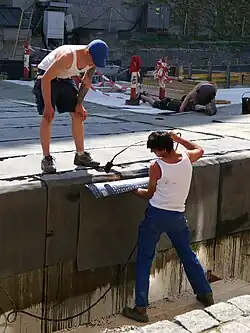 Eine moderne allerdings auch sehr kostenintensive Alternative bietet die Heißluftverschweißung.[1] Dies ist eine Nahtfügetechnik bei Kunststoffbahnen, bei welcher die mindestens 5 cm überlappenden Kunststoffbahnen ohne Zugabe von Fremdstoffen thermisch, also nur mit Heißluft erweicht und sofort unter Druck zusammengefügt werden. Hierbei werden Schweißtemperaturen von 450 bis 500 °Celsius und ein Anpressdruck von 5 bis 6 kp benötigt. Da die Schweißgeschwindigkeit auf die Anpressung der jeweiligen Kunststoffbahnen abzustimmen sind, werden Probeschweißungen vorgenommen. Die wesentlichen Faktoren für die Verschweißbarkeit per Heißluftverschweißung sind vor allem die Materialqualität, die technische Ausrüstung, die verwendete Art der Kunststoffbahn, der Untergrund sowie die Umgebungstemperatur, der Feuchtigkeitsgehalt und der Alterungsgrad der zu verschweißenden Bahnen. Die Arbeiten werden mit einem speziellen Schweißautomaten[2] durchgeführt.